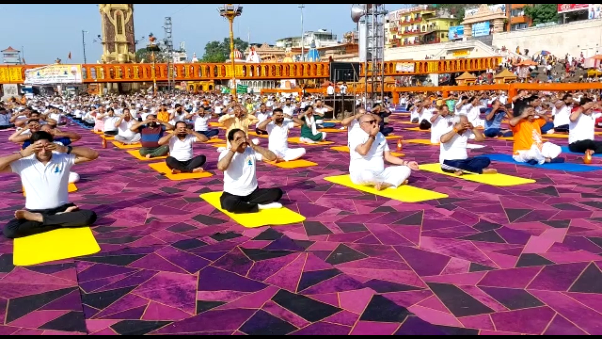 आज अंतरराष्ट्रीय योग दिवस के मौके पर धर्मनगरी हरिद्वार की हर की पौड़ी पर योगाभ्यास किया गया, श्री गंगा सभा और जिला प्रशासन द्वारा संयुक्त रूप से आयोजित योगाभ्यास में डीपीएस स्कूल के बच्चे भी शामिल हुए, हर की पौड़ी पर योगाभ्यास के कार्यक्रम में मुख्य अतिथि के रुप में पहुंचे केंद्रीय मंत्री गिरिराज सिंह, सांसद रमेश पोखरियाल निशंक, कैबिनेट मंत्री सौरव बहुगुणा, बीजेपी के प्रदेश अध्यक्ष मदन कौशिक गंगा सभा के अध्यक्ष प्रदीप झा और महामंत्री तन्मय वशिष्ठ सहित जिला प्रशासन के अधिकारियों ने योग किया,