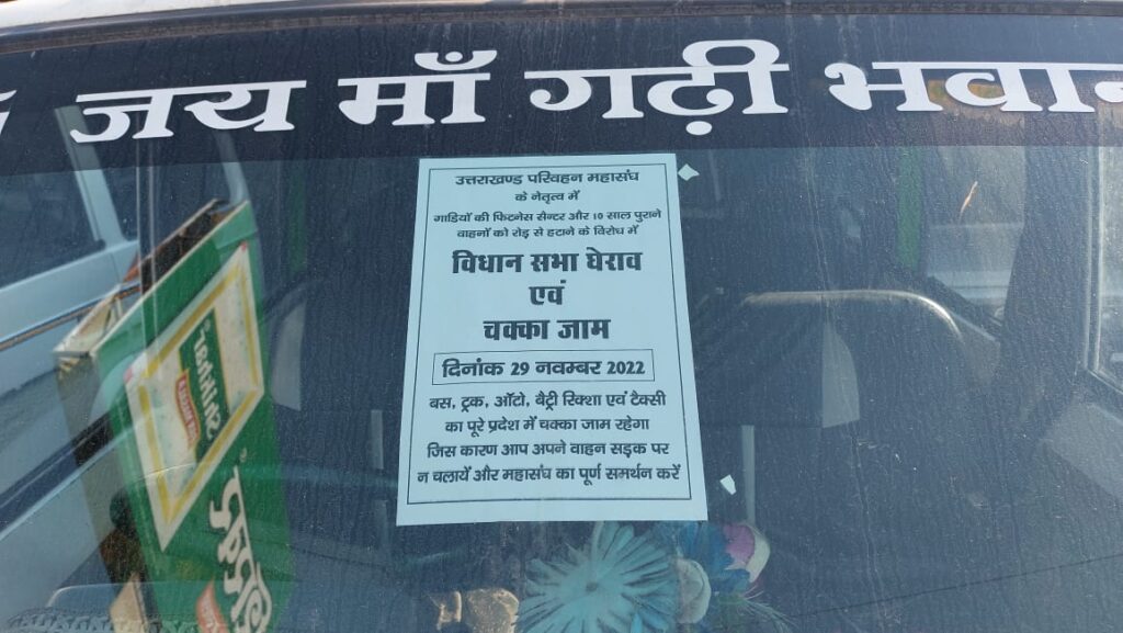 उत्तराखंड परिवहन महासंघ के आवाह्न पर हरिद्वार जिले की करीब 45 विभिन्न कमर्शियल वाहनों की यूनियन और इनसे जुड़े करीब 20 हजार कमर्शियल वाहनों का मंगलवार को चक्का जाम रहेगा। गाड़ियों की फिटनेस सेंटर और 10 साल पुराने वाहनों को सड़क से बाहर करने के निर्णय के बाद कोई सुनवाई न होने पर महासंघ के नेतृत्व में विधानसभा घेराव और चक्का जाम करने का निर्णय लिया गया। हरिद्वार में टैक्सी मैक्सी, सवारी कार, ऑटो, विक्रम, ई-रिक्शा आदी वाहन हरिद्वार की सड़कों पर चक्का जाम का पर्चा चस्पा कर संचालित होते नजर आए। महासंघ ने बड़े स्तर पर पूरे उत्तराखंड में चक्का जाम करने का निर्णय लिया। हरिद्वार में करीब 45 यूनियन महासंघ के चक्का जाम के पक्ष में आ गई है। विभिन्न यूनियन के पदाधिकारी चक्का जाम का समर्थन करते नजर आए।