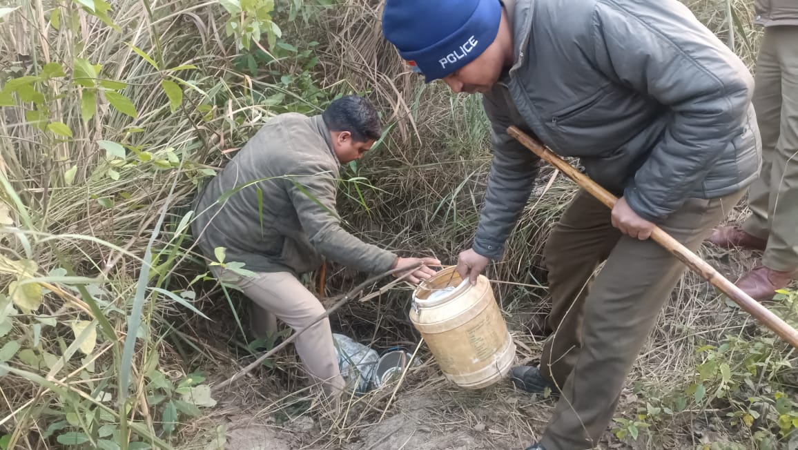 उत्तराखंड मुख्यमंत्री पुष्कर सिंह धामी के नशामुक्त देवभूमि मिशन 2025 को सफल बनाकर समाज को सुधारने के लिए एसएसपी अजय सिंह द्वारा दिए गए दिशा निर्देश के तहत हरिद्वार जनपद लक्सर में पुलिस टीम के द्वारा डेरा कलाल के घने जंगलो व नालों में आधुनिक टेक्नोलॉजी का इस्तेमाल करते हुए ड्रोन कैमरे की मदद से अचानक छापेमारी कर कच्ची शराब बनाने के लिए गड्ढो के अंदर त्रिपाल में छुपाकर रखे गए करीब 10 हजार लीटर लाहन को मौके पर ही नष्ट करते हुए बड़ी मात्रा में कच्ची शराब बनाने के उपकरण बरामद कर कार्रवाई की गई। पुलिस टीम जंगलों व नालों में अड्डा बनाकर कच्ची शराब बनाने के कारोबार में लगे अभियुक्तों को चिन्हित कर रही है। जल्द ही आसपास के देहात क्षेत्र के सभी घने जंगलों एवं गुप्त स्थानों पर भी इसी प्रकार कड़ी कार्रवाई करते हुए अवैध कार्य करने वालों को चिन्हित कर उन पर नकेल कसी जाएगी। हरिद्वार पुलिस की इस प्रकार की कार्रवाई से अपराधियों में खौफ का माहौल तेजी से पसर रहा है। इस प्रकार के अवैध कार्यों में लिप्त रहने वालों के रिकॉर्ड को खंगालते हुए लक्सर पुलिस द्वारा अभियुक्त संतरपाल और मोनू के विरुद्ध गुंडा एक्ट के तहत कार्रवाई भी की गई।