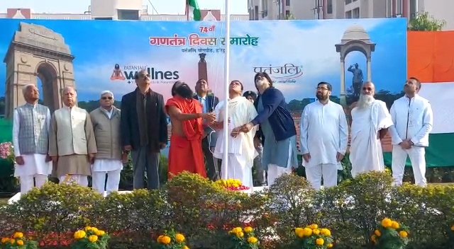 इस दौरान बाबा रामदेव ने सभी देशवासियों को 74 वें गणतंत्र दिवस की बधाई देते हुए कहा कि आज 74 वें गणतंत्र दिवस पर हम यह संकल्प लें कि देश को आर्थिक गुलामी लूट बर्बादी से बचाने के लिए साथ ही शिक्षा और चिकित्सा की लूट और दरिद्रता से भारत को मुक्त बनायेगे और अपनी सांस्कृतिक वैभव गौरव को साथ में लेकर हम एक स्वस्थ समृद्ध और संस्कारवान भारत के निर्माण के लिए संकल्पित हो। सभी देशवासियों को अपने हिस्से की जिम्मेदारी लेनी चाइए जैसे इस गणतंत्र दिवस पर हमने जिम्मेदारी ली है। हमने अब तक 5 लाख लोगों को रोजगार दिया है। और आगे 5 लाख लोगों को और रोजगार देने का आज हमने संकल्प लिया है।