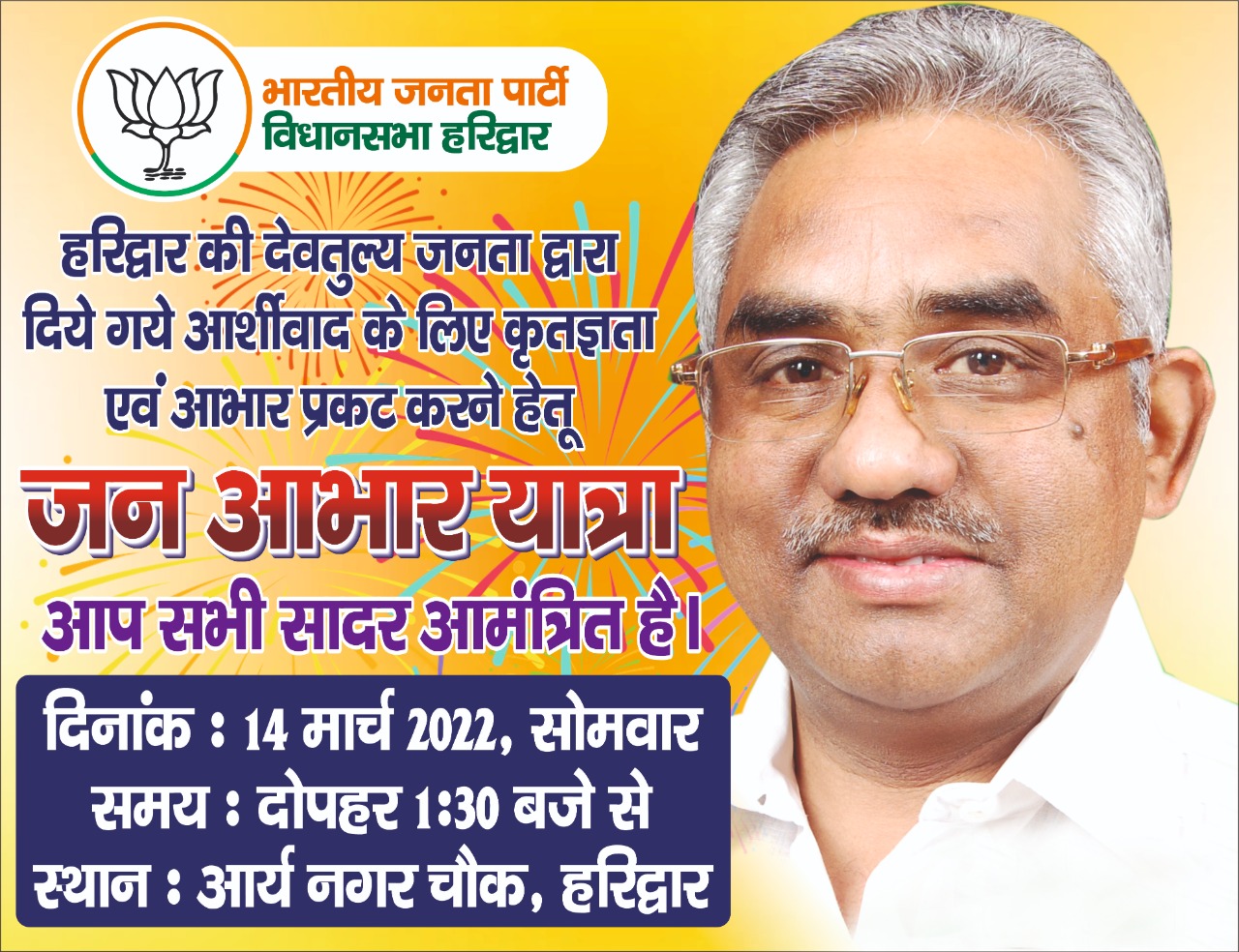 भारतीय जनता पार्टी के जिला महामंत्री विकास तिवारी ने बताया कि भाजपा प्रदेश अध्यक्ष एवं हरिद्वार विधानसभा के विधायक माननीय मदन कौशिक के पांचवी बार विजय होने के उपलक्ष में आज दोपहर 1:30 बजे आर्य नगर चौक से एक जन आभार यात्रा का आयोजन किया गया है। यह यात्रा आर्य नगर चौक से हर की पौड़ी तक जाएगी और वहां पर गंगा पूजन के बाद यात्रा का समापन होगा। विकास तिवारी ने बताया की इस यात्रा को लेकर के हरिद्वार की जनता में बहुत उत्साह है। पूरे रास्ते में जगह जगह मदन कौशिक के स्वागत कार्यक्रम आयोजित किए जाएंगे और ढोल नगाड़े डीजे और झंडों के साथ यात्रा का संचालन किया जाएगा।