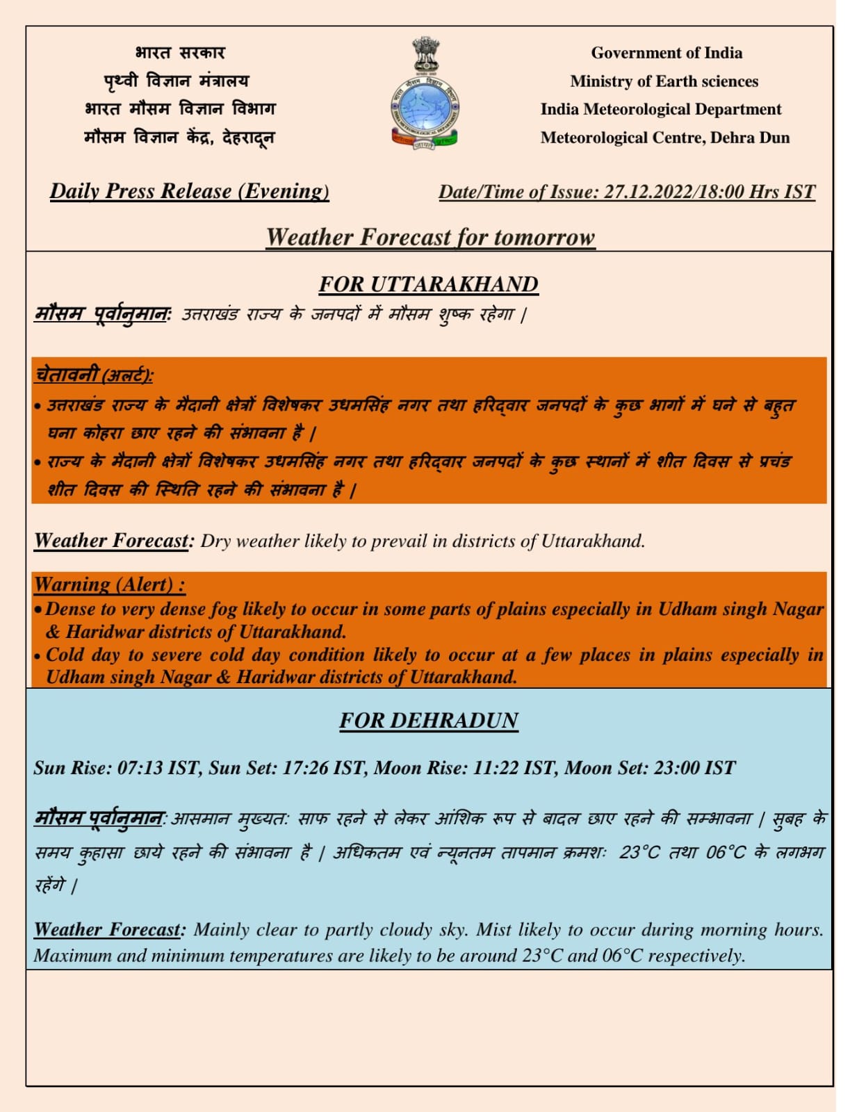 प्रतीक जैन प्रभारी जिलाधिकारी ने अवगत कराया है कि निदेशक, भारतीय मौसम विज्ञान केन्द्र, देहरादून द्वारा जानकारी दी गयी है कि दिनांक 27 से 31 दिसम्बर, 2022 तक जारी मौसम पूर्वानुमान में दिनांक 28 एवं 29 दिसम्बर, 2022 को उत्तराखण्ड राज्य के मैदानी क्षेत्रों विशेषकर ऊधमसिंहनगर व हरिद्वार जनपदों के कुछ भागों में घने से बहुत घना कोहरा छाये रहने तथा कुछ स्थानों में शीत दिवस से प्रचण्ड शीत दिवस की स्थिति रहने की सम्भावना के दृष्टिगत ओरेंज अलर्ट जारी किया गया ।