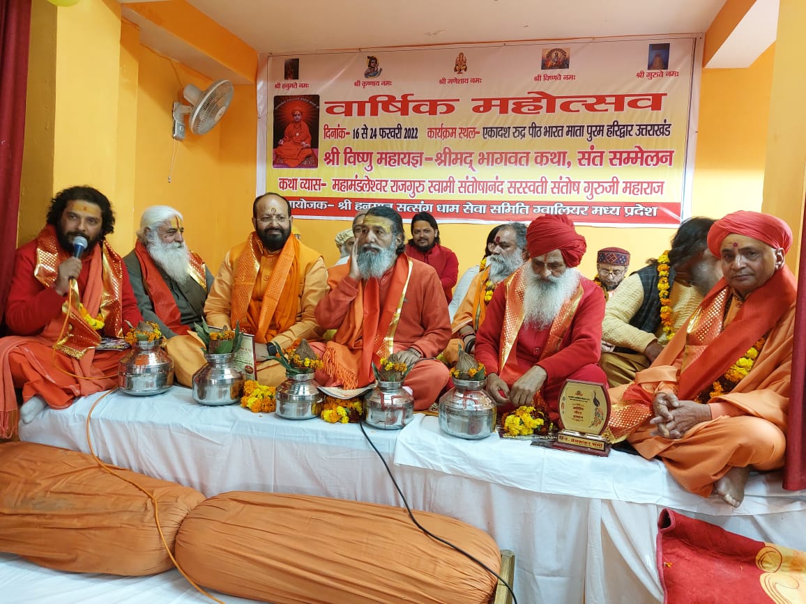 श्री हनुमान सत्संग धाम श्री हरि अवतार दर्शन पीठ ग्वालियर मध्य प्रदेश के तत्वाधान में भारतमाता पुरम स्थित एकादश रूद्र पीठ आश्रम में आयोजित श्रीमद्भावगत कथा के विश्राम अवसर पर संत सम्मेलन का आयोजन किया गया। संत सम्मेलन के दौरान उपस्थित श्रद्धालु भक्तों को संबोधित करते हुए महामण्डलेश्वर स्वामी हरिचेतनानंद महाराज ने कहा कि जिस स्थान पर श्रीमद्भावगत कथा व संत सम्मेलन का आयोजन हो जाता है। वह स्थान सदैव के लिए पूज्यनीय हो जाता है। उन्होंने कहा कि श्रीमद्भावगत कथा श्रवण का अवसर बेहद सौभाग्य से प्राप्त होता है। श्रद्धालु भक्तों को कथा श्रवण का अवसर प्रदान करने के लिए महामण्डलेश्वर राजगुरू स्वामी संतोषानंद महाराज बधाई के पात्र हैं। स्वामी ऋषिश्वरानंद महाराज ने कहा कि संत महापुरूषों के सानिध्य में ही कल्याण का मार्ग प्रशस्त होता है। संतों के सानिध्य में श्रीमद्भागवत कथा का श्रवण व मनन करने से जीवन के सभी संताप दूर हो जाते हैं। बाबा बलराम दास हठयोगी ने कहा कि श्रीमद्भावगत कथा जीवन जीने की कला सिखाती है। संतों ने समाज को सदैव धार्मिक मान मर्यादाओं का पालन करते हुए आदर्श समाज बनाने की प्ररेणा दी है। उन्होंने कहा कि जब तक समाज में संस्कृत एवं संस्कृति जीवंत है। तभी तक मानव में सुसंस्कारों का प्रवेश हो रहा है। धर्म एवं संस्कृति के संरक्षण संवर्द्धन के लिए संत समाज अग्रणीय भूमिका निभाता चला आ रहा है। अब इसकी जिम्मेदारी युवा संतों को अपने कंधों पर उठानी होगी। महामण्डलेश्वर स्वामी ललितानंद गिरी एवं युवा भारत साधु समाज के राष्ट्रीय महामंत्री स्वामी रविदेव शास्त्री महाराज ने कहा कि श्रीमद्भावगत कथा में समाहित ज्ञान को जो व्यक्ति जीवन व्यवहार में शामिल कर लेता है। श्रीहरि की कृपा से उसका जीवन भवसागर से पार हो जाता है। महामण्डलेश्वर राजगुरू स्वामी संतोषानंद महाराज की प्ररेणा से श्रीमद्भागवत कथा का आयोजन कर श्री हनुमान सत्संग धाम श्री हरि अवतार दर्शन पीठ ने सराहनीय कार्य किया है। महामण्डलेश्वर राजगुरू स्वामी संतोषानंद महाराज ने उपस्थित संतजनों का आभार व्यक्त करते हुए कहा कि एक ही स्थान पर संतों का दर्शन सभी के लिए प्रेरणादायी है। गंगा तट पर श्रीमद्भावगत कथा का श्रवण व संत दर्शन से जीवन के सभी संकट दूर हो जाते हैं। परिवारों में सुख समृद्धि का वास होता है। इसलिए इस अवसर को कभी गंवाना नहीं चाहिए और प्रत्येक परिवार को धार्मिक अनुष्ठानों में भाग लेकर अपने धर्म के प्रति समर्पण भाव दिखाते हुए जागरूक रहना चाहिए। कार्यक्रम में पधारे सभी संत महापुरूषों का सुरेंद्र शर्मा ने फूलमाला पहनाकर स्वागत किया। इस अवसर पर पूर्व पालिकाध्यक्ष सतपाल ब्रह्मचारी, महंत रघुवीर दास, महाम