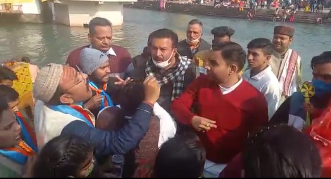 हरकी पौड़ी पर पूजा के बाद नारेबाजी कर रहे सुराज सेवा दल के कार्यकर्ताओं और गंगा सभा के पदाधिकारियों में झड़प