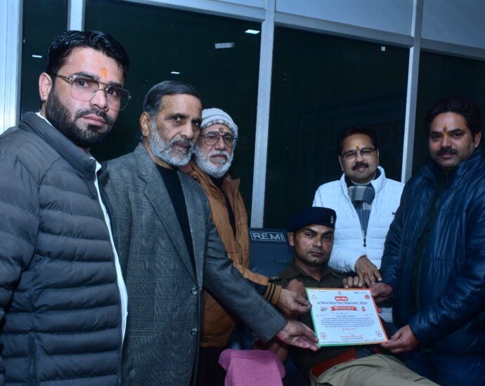 हरिद्वार, 10 जनवरी। वरिष्ठ पत्रकार स्वर्गीय वेद प्रकाश चौहान की स्मृति में प्रैस क्लब एवं हरिद्वार की गूंज व ब्लड वालिंटियर्स के तत्वाधान में प्रैस क्लब सभागार में स्वैच्छिक रक्तदान शिविर का आयोजन किया गया। शिविर में 67 यूनिट रक्त एकत्र हुआ। रक्तदान शिविर का शुभारंभ अतिरिक्त पुलिस अधीक्षक विपिन कुमार, प्रैसक्लब अध्यक्ष अमित शर्मा, महामंत्री प्रदीप जोशी, समाजसेवी डा.विशाल गर्ग, वरिष्ठ पत्रकार रजनीकांत शुक्ला, रजत चौहान, संजय चौहान, ऋषभ चौहान आदि ने दीप प्रज्वलित कर किया। एसपी संचार विपिन कुमार ने भी रक्तदान किया और कहा कि रक्तदान महादान है। रक्तदान को लेकर लोगों में अनेक भ्रांतियां बनी रहती हैं। रक्तदान करने से शरीर में किसी भी प्रकार की कमजोरी नहीं आती है। बल्कि नए रक्त का संचार होन से शरीर स्वस्थ होता है। सभी को रक्तदान अवश्य करना चाहिए। प्रैस क्लब अध्यक्ष अमित शर्मा एवं महामंत्री प्रदीप जोशी ने कहा कि स्वर्गीय वेद प्रकाश जीवन पर्यंत अपनी लेखनी के माध्यम से समाज को जागरूक करने का काम करते रहे। सामाजिक दायित्व का निर्वहन करने में भी उन्होंने अग्रणी भूमिका निभाई। उन्होंने कहा कि आपके द्वारा दिया गया रक्त किसी के प्राणों की रक्षा करता है। इसलिए रक्तदान अवश्य करें। समाजसेवी डॉक्टर विशाल गर्ग ने कहा कि रक्तदान से बड़ा कोई दान नहीं है। रक्त कोष की कमी को दूर करने के लिए समय-समय पर रक्तदान करें रजत चौहान एवं संजय चौहान ने कहा कि रक्तदान से बढ़कर कोई पुण्य कार्य नहीं है। इसलिए स्वयं रक्तदान करने के साथ दूसरों को भी रक्तदान करने के लिए प्रेरित करें। रक्तदान करने वालों में संजीव, सचिन सैनी, योगेश कुमार, सागर कुमार, अमित कुमार, विनय, राजवीर, जहांगीर मलिक, विकास कुमार, नितिन चौहान, गगन, नीटू, अजय कुमार, राज गुप्ता, राकेश कुमार, सिद्धार्थ रावल, विपिन, गौरव भाटिया, रवि बाबू शर्मा, योगेश, नवीन कुमार, भोला शर्मा आदि प्रमुख रूप से शामिल रहे। इस दौरान रूड़की नगर निगम की मेयर प्रत्याशी पूजा गुप्ता, दीपक नौटियाल, बिजेंद्र्र हर्ष, मुदित अग्रवाल, महावीर नेगी, श्रवण झा, संजय रावल, सुनील पाल, शिवकुमार शर्मा, मनोज रावत, रूपेश वालिया, विकास चौहान, तनवीर अली, अमरीश कुमार, अब्दुल सत्तार, संजीव, शुभम, सागर कुमार, अंकित कुमार, सौरभ, शाहनवाज सलमानी, दलीप गुप्ता, विपिन, मनीष, मेहरबान, विशाल चौहान, सन्नी चौहान, जितेंद्र कुमार, जावेद अंसारी, नितिन चौहान आदि मौजूद रहे।