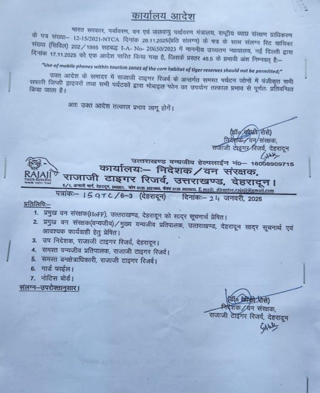 राजा जी टाइगर रिज़र्व में सफारी के दौरान पर्यटकों और चालको को मोबाइल ले जाने पर प्रतिबंद लगा दिया गया है
