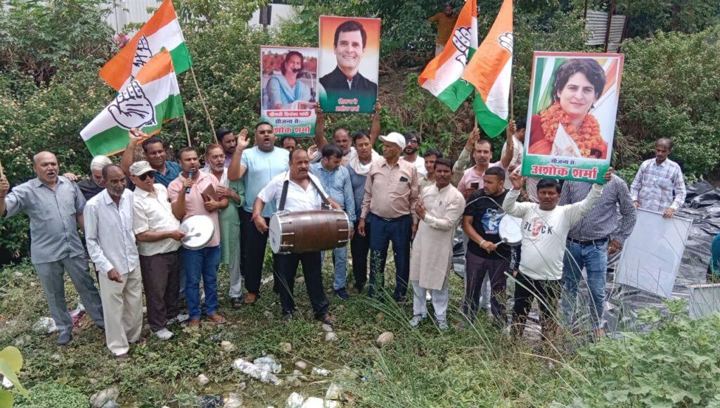 बरसाती नाले में उतरकर कांग्रेसियों ने किया धरना प्रदर्शन,ढोल थालियां बजाकर किया विरोध