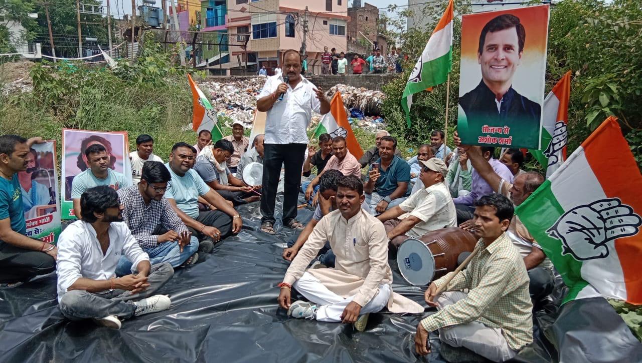 बरसाती नाले में उतरकर कांग्रेसियों ने किया धरना प्रदर्शन,ढोल थालियां बजाकर किया विरोध