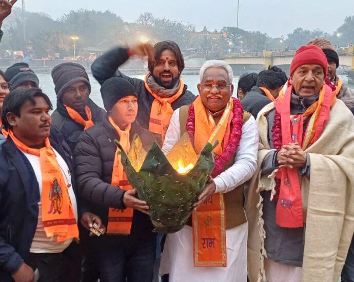 राम लला की प्राण प्रतिष्ठा को लेकर सुभाष घाट पर चल रही 11 दिनों की दीपावली का आज समापन हो गया। पूर्व कैबिनेट मंत्री और नगर विधायक मदन कौशिक मुख्य रूप से उपस्थित रहे। बता दे की गिरिवर नाथ जनकल्याण धर्मार्थ सेवा ट्रस्ट के तत्वाधान में 1100 दीपो के दान का संकल्प लिया गया था। जिसमे प्रतिदिन अलग अलग क्षेत्रों से जुड़े हुए समाजसेवियों ने प्रतिभाग किया। संस्था के अध्यक्ष कमल खड़का ने कहा गंगा जी के माध्यम से अयोध्या में राम लला को संदेश भेजने का काम किया गया। उन्होंने बताया की इसमें प्रतिदिन दीपो को गंगा जी में प्रवाहित किया गया। कमल ने बताया की यह 500 सालो के अथक प्रयासों और संघर्ष का ही नतीजा है की आज हमे अयोध्या में राम लला विराजमान होते देख पा रहे है। संकल्प की पूर्णाहुति में मुख्य रूप से शामिल रहे मदन कौशिक ने गिरिवर नाथ जनकल्याण धर्मार्थ सेवा ट्रस्ट के प्रयासों की तारीफ करते हुए कहा की राम के प्रति इनका भाव ही है जो यह संकल्प इन्होंने लिया। उन्होंने कहा की आज सनातन के लिए बहुत बड़ा दिन है की 22 जनवरी को भगवान राम अपने मंदिर में स्थापित हो जायेगे।