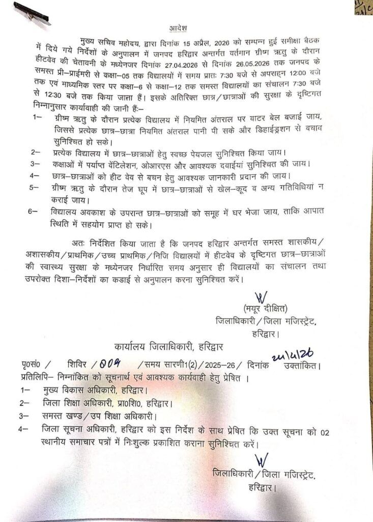शासन के निर्देशों के क्रम जिलाधिकारी मयूर दीक्षित ने जनपद हरिद्वार में हीटवेव से बच्चों की सुरक्षा के लिए 27 अप्रैल 2026 से 26 मई 2026 तक विद्यालयों के समय में परिवर्तन किया गया है। उन्होंने प्री-प्राइमरी से कक्षा 5 तक विद्यालय का समय प्रातः 7:30 बजे से 12:00 बजे तक तथा कक्षा 6 से 12 तक के छात्र-छात्राओं 7:30 बजे से 12:30 बजे तक कक्षाएं संचालित होंगे।