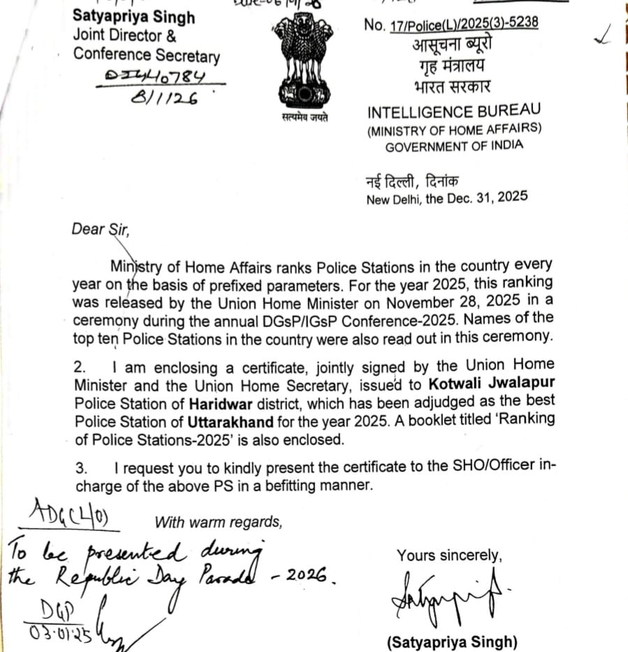 भारत सरकार द्वारा प्रत्येक वर्ष राष्ट्रीय स्तर पर चयनित किए जाने वाले बेस्ट पुलिस स्टेशन की सूची में इस वर्ष उत्तराखंड में कोतवाली ज्वालापुर जनपद हरिद्वार का नाम शामिल किया गया है। यह चयन उत्तराखंड राज्य की पुलिस के लिए गर्व और सम्मान का विषय है।