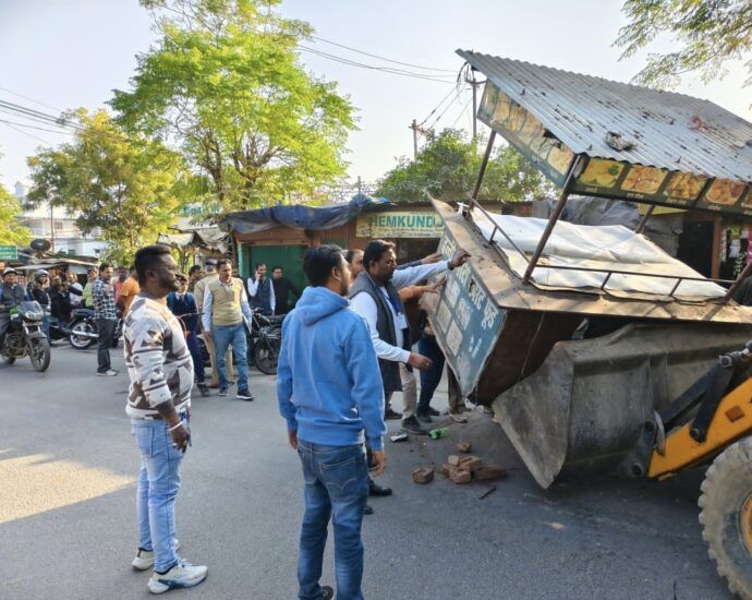 हरिद्वार, 17 नवम्बर। नगर निगम एवं पुलिस प्रशासन की टीम ने वार्ड 17 टिबड़ी में अतिक्रमण के खिलाफ अभियान चलाते हुए राजकीय प्राथमिक विद्यालय एवं माध्यमिक विद्यालय के मुख्य प्रवेश द्वार पर अवैध रूप से लगाए गए तीन खोखों को जेसीबी की सहायता से ध्वस्त कर दिया तथा दो ठेलियों को जब्त कर लिया। जिलाधिकारी के निर्देश पर नगर निगम द्वारा अतिक्रमण हटाने की कार्रवाई की गयी है। जन सुनवाई कार्यक्रम में अतिक्रमण का मामला सामने पर जिलाधिकारी ने नगर निगम को कार्रवाई के निर्देश दिए थे। निर्देशों के अनुपालन में सोमवार को उप नगर आयुक्त दीपक गोस्वामी, मुख्य सफाई निरीक्षक संजय शर्मा, अतिक्रमण हटाओ दस्ते के प्रभारी आदित्य तेश्वर ने मौके पर पहुंचकर जेसीबी से खोखे ध्वस्त कर दिए और ठेलियों को जब्त कर लिया। इस दौरान पुलिस बल भी मौजूद रहा। निगम प्रशासन ने विद्यालय के आसपास किसी भी प्रकार का अवैध अतिक्रमण बर्दाश्त नहीं करने और दोबारा अतिक्रमण करने पर कड़ी कार्रवाई की चेतावनी दी है।