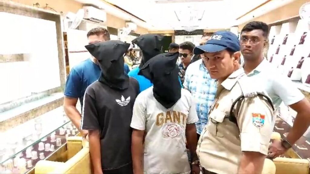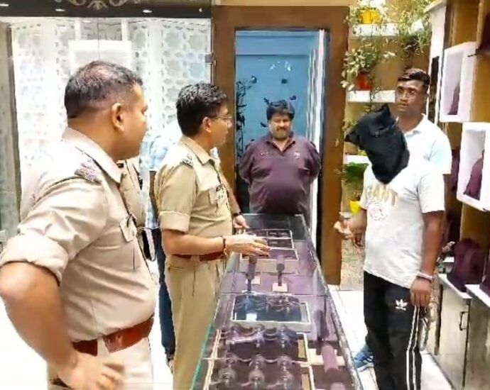 ज्वेलर्स शोरूम में करोड़ो की डकैती डालने वाली घटना का पुलिस ने किया री क्रिएशन,तीन बदमाशों को पुलिस लेकर आई शोरूम पर