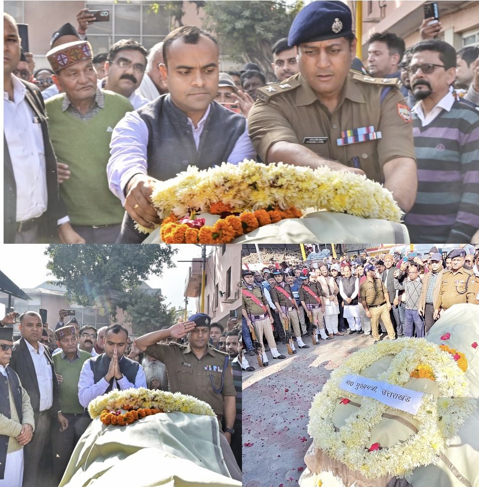 जिलाधिकारी मयूर दीक्षित एवं वरिष्ठ पुलिस अधीक्षक प्रमेंद्र सिंह डोभाल ने पुष्पचक्र अर्पित कर उन्हें नमन करते हुए अंतिम विधाई दी।