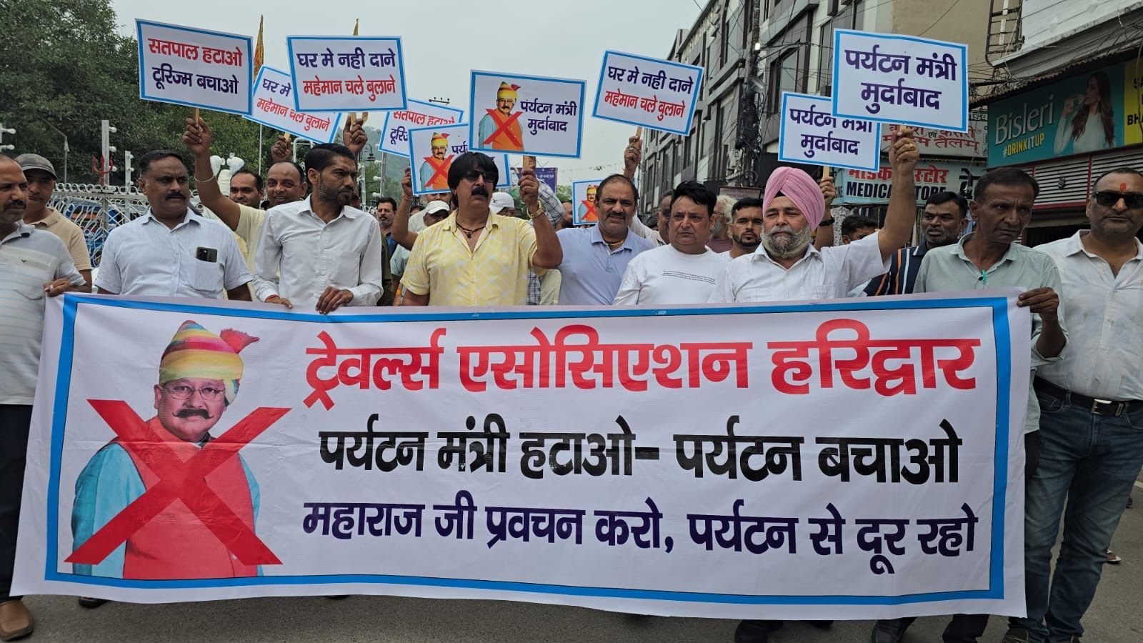 उत्तराखंड सरकार में पर्यटन मंत्री सतपाल महाराज द्वारा उत्तराखंड में प्रदेश से बाहर के ट्रेवल्स व्यवसायियों को प्रदेश में आने का न्योता देने के बयान के बाद हरिद्वार के ट्रेवल्स व्यवसायियों में पर्यटन मंत्री के बयान को लेकर खासी नाराजगी देखने को मिल रही है जिसके चलते हरिद्वार के विभिन्न ट्रेवल्स व्यवसायियों ने शिव मूर्ति चौक पर उत्तराखंड सरकार के पर्यटन मंत्री सतपाल महाराज के खिलाफ विरोध प्रदर्शन किया, इस मौके पर ट्रेवल्स व्यवसायियों का कहना था कि सतपाल महाराज को अपने प्रवचन तक सीमित रहना चाहिए, उन्होंने कहा कि पर्यटन मंत्री सतपाल महाराज ने आज तक हरिद्वार के व्यापारियों के साथ किसी भी प्रकार की कोई बैठक तक नहीं की है, इस वर्ष जिस तरह से उत्तराखंड के हालात है ओर मार्ग बंद होने के चलते यात्रा बार बार बंद हो रही है