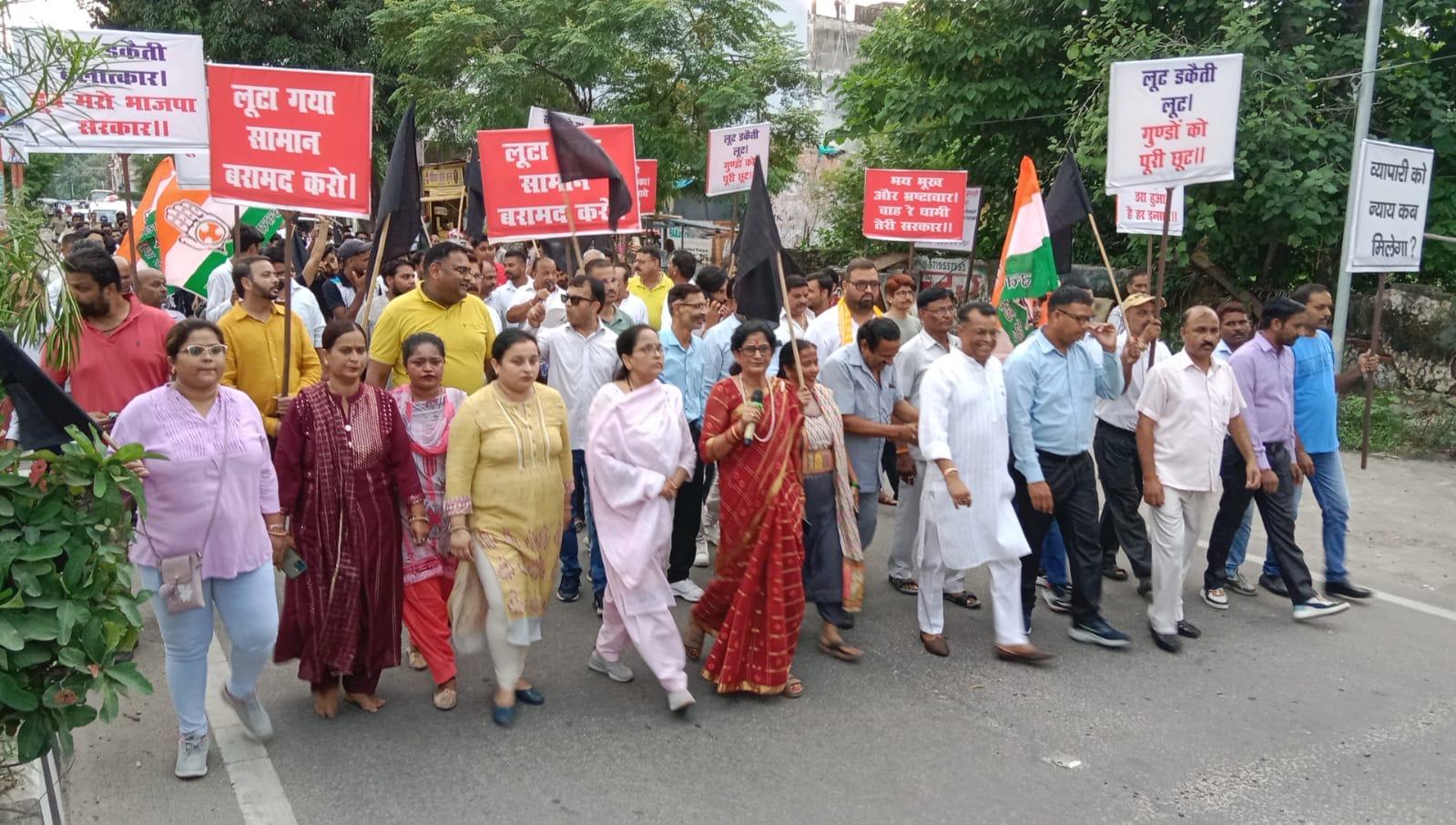शहर में डकैती, लूटमार, चेन स्नैचिंग, चोरी और बिगड़ती कानून व्यवस्था के विरोध में निवर्तमान मेयर अनिता शर्मा के नेतृत्व में शंकर आश्रम तिराहे से चंद्राचार्य चौक तक काले झंडे लेकर विशाल जुलूस निकाला गया। इस अवसर पर निवर्तमान मेयर अनिता शर्मा ने कहा कि शहर में कानून व्यवस्था दिनों दिन बिगड़ती जा रही है। अपराधियों में कानून का खौफ समाप्त हो गया। महिलाओं का घर से बाहर निकलना मुश्किल हो गया है। चारों तरफ खौफ का माहौल बना हुआ है। पूर्व सभासद अशोक शर्मा और वरिष्ठ नेता राजबीर सिंह चौहान ने कहा कि बीजेपी शासन में कोई भी सुरक्षित नहीं है। विधायक के घर से कुछ ही दूरी पर ज्वेलर्स के शोरूम में करोड़ों की डकैती हो जाती है। पास में चौराहे पर पुलिस भी रहती है फिर भी इतनी बड़ी घटना होना पुलिस की कार्यशैली पर सवाल खड़े करता है। संजय पालीवाल और विमला पांडे ने कहा कि जिस सरकार में जनता सुरक्षित नहीं हो उसे रहने का कोई अधिकार नहीं।